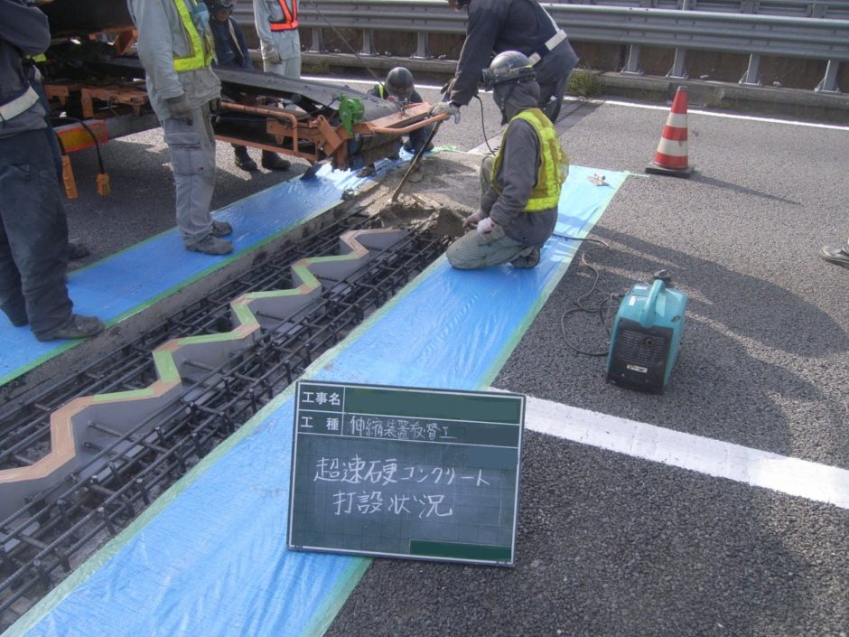 通常伸縮装置の取替工事においては、当日中に交通解放を行うことが一般的であり、また、夜間施工を実施する場合では、翌朝には工事を終えるなど時間の制約が設けられます。